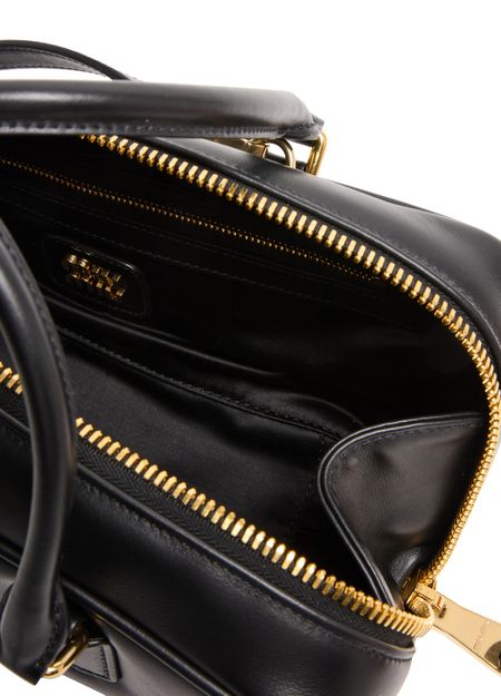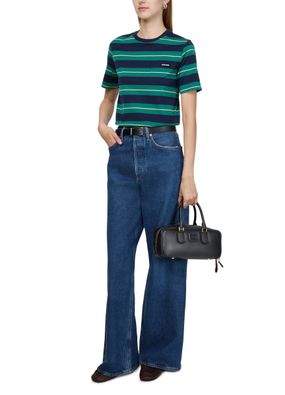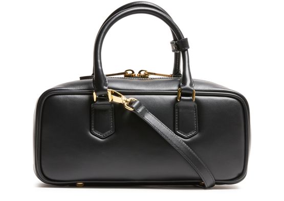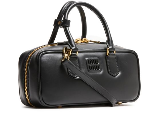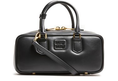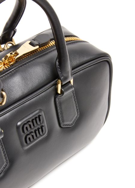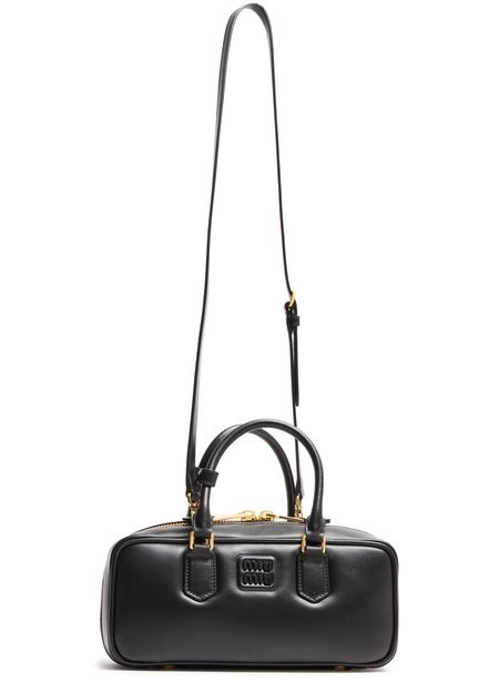 Reveal Miu Miu's Arcadie leather handbag, a masterpiece of modern design. Crafted from smooth leather, it features a metallic "Miu Miu" lettering and a versatile adjustable, detachable strap. The large interior compartment and zippered pocket ensure functionality meets elegance, all finished with a gold touch.