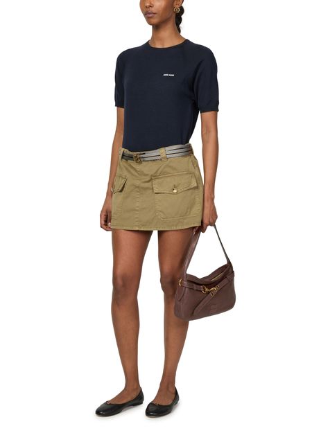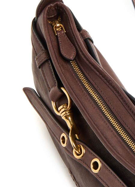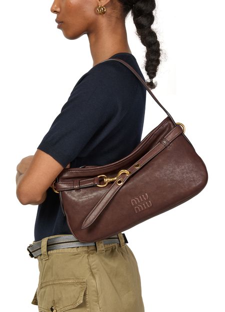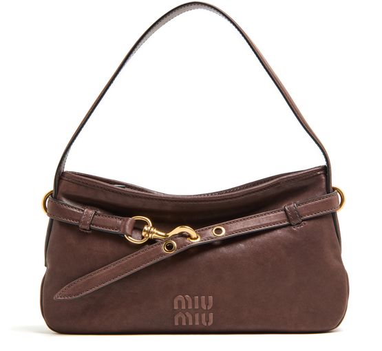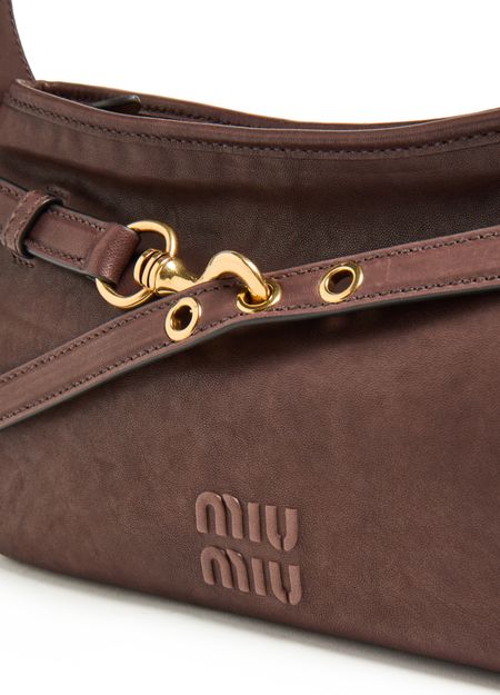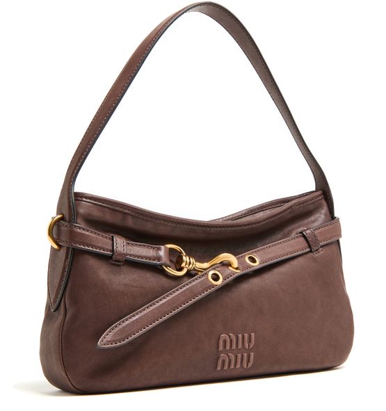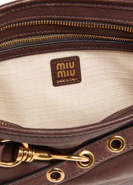 Miu Miu's Aventure nappa leather bag is a stylish mini bag designed for effortless elegance. Hand carried with a thin strap, it features a zipper closure and a zippered interior pocket for essentials. The embossed logo and visible topstitching add sophistication, while the gold finish enhances its luxurious appeal.