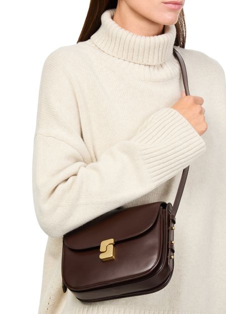 Reveal Soeur's Bellissima mini shoulder bag, featuring a sophisticated flap closure and a gold finish. This stylish piece boasts a single handle and wide strap, complemented by visible topstitching that adds a modern touch.
