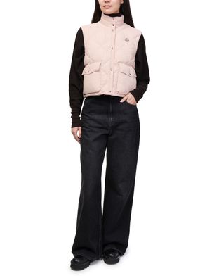 Reveal Moncler's sleeveless puffer jacket with a high neck silhouette and button fastening. The short cut and padded texture offer a modern edge, while flap pockets and an embroidered chest logo add refined detail. Perfect for layering, this piece transitions seamlessly from city strolls to weekend escapes.