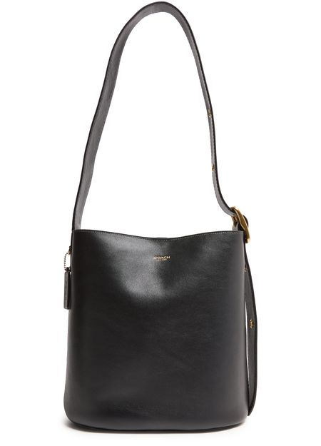 Reveal Coach's Bleecker bucket bag, a masterpiece of style and functionality. Crafted from grained leather, it features a decorative label with an embossed logo. The twist lock closure and single handle add elegance, while the detachable interior purse and visible topstitching enhance its practicality.