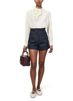 Reveal Max Mara blouse with pussycat bow, featuring long, cuffed sleeves for a refined silhouette. The elegant neckline and tailored fit create a polished look, while the soft fabric ensures comfort. Perfect for elevating both professional and casual ensembles with timeless sophistication.
