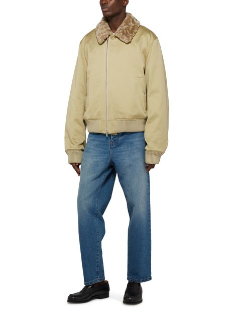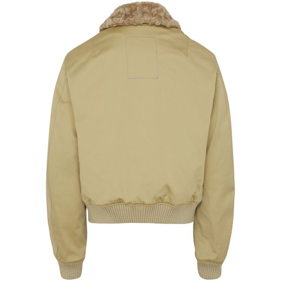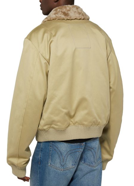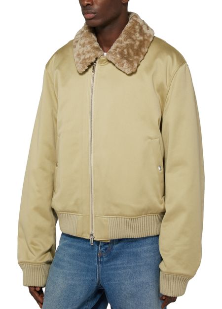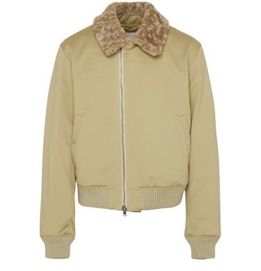 This long-sleeved Burberry bomber jacket features a zipper closure and side pockets for added convenience. The fur detail adds a luxurious touch to this versatile and stylish piece. Perfect for keeping warm and looking fashion-forward during colder weather. A must-have addition to any wardrobe for a contemporary and sophisticated look.