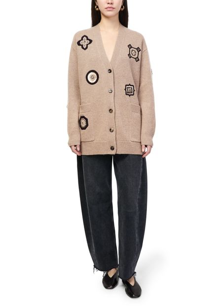 Reveal Max Mara's ribbed cardigan, featuring geometric embroidered details and long cuffed sleeves. The button fastening adds a refined touch, while the textured finish ensures a modern silhouette. Perfect for versatile styling, this piece transitions effortlessly from day to evening with understated sophistication.