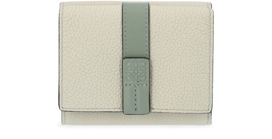 This lightly grained calf skin wallet by Loewe has a large tab. Elegant and sophisticated, the square shape makes it easy to put away.