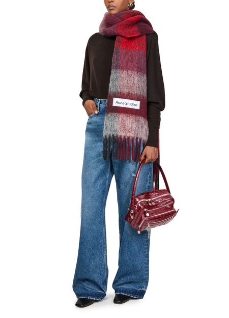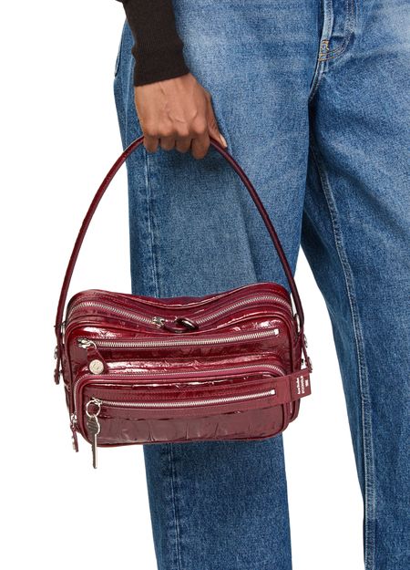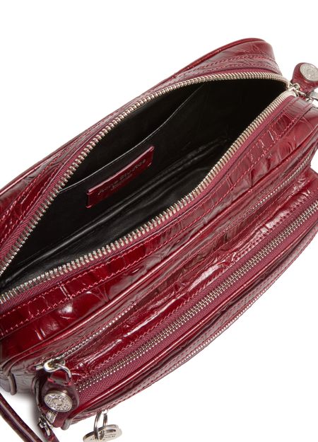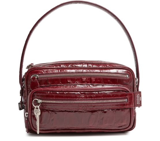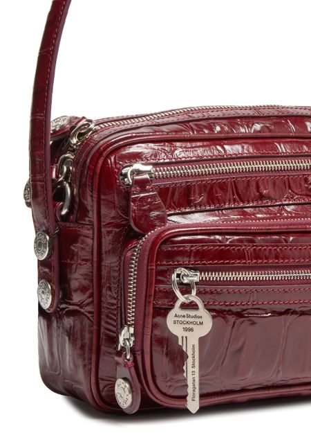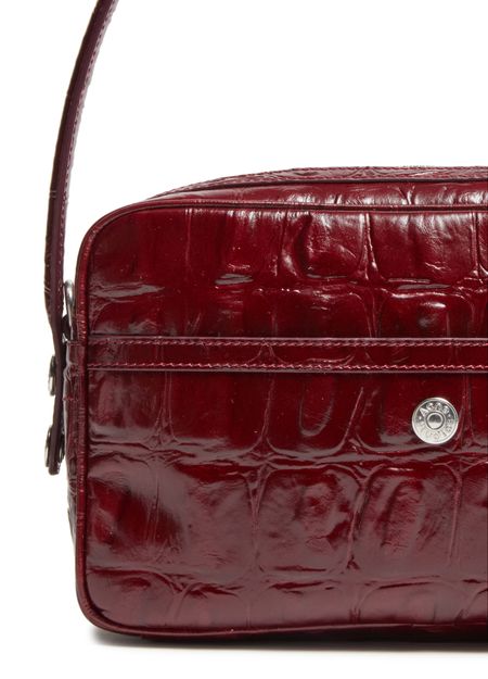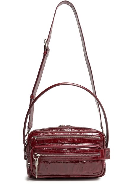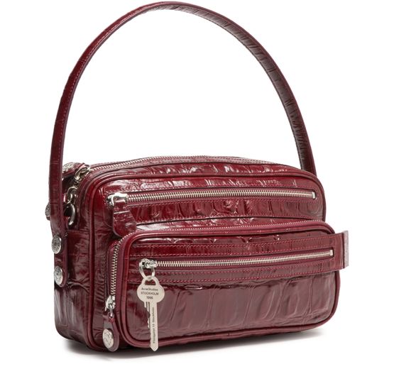 Reveal Acne Studios's Camero Party shoulder bag in croco print, a masterpiece of modern design. Crafted from crocodile-embossed leather, this bag features a sleek single handle and a secure zipper closure. Its practical elegance is enhanced by a zippered front pocket and an open interior pocket, all accented with silver finishes.