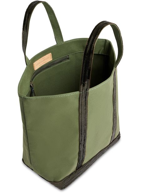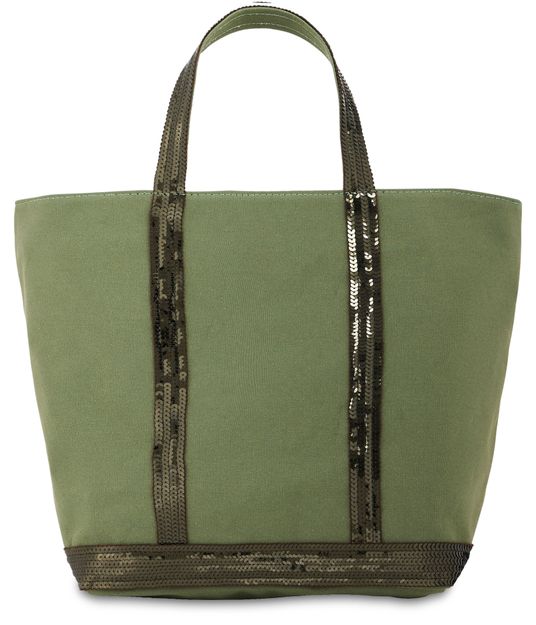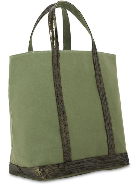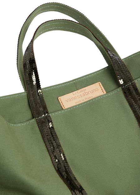 Cotton canvas cabas tote bag highly durable and waterproof, topped with sequins. This is the standard size for this model of tote bag and can be carried only at hand. It has an inside zipped pocket, which is topped off with a label of natural vegetable leather hot stamped with "Le Cabas Vanessa Bruno made in France".