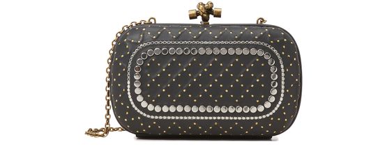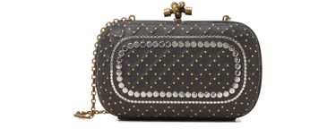 The minaudière with chain from Bottega Veneta is a retro and feminine jewel-like accessory. This oblong piece features inner compartments and the Italian fashion house’s emblematic knot-shaped clasp. Dotted with gold and silver studs, it will house all your essentials for an evening out.