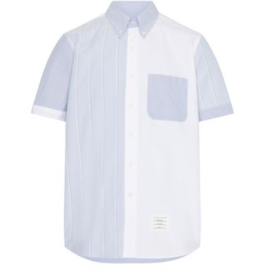 Thom Browne's color block design shirt showcases a stylish short-sleeved silhouette, perfect for casual outings. With a front buttoned closure and button fastening, it offers a refined look. The breast pocket adds functionality, while the striped print enhances its charm. A logo at the back label completes this trendy piece.