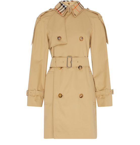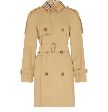 Burberry's Cotton trench coat showcases a knee-length silhouette with a front buttoned closure and three elegant buttons. Long-sleeved and belted, it features a classic collar and large side patch pockets for practicality. The appliquéd logo adds a touch of sophistication, while the logo at the back label signifies timeless style.