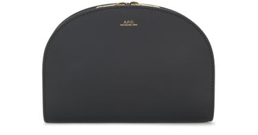 APC's Demi-Lune clutch features a sleek and modern design with a zipper closure for secure storage. The metallic logo on the front adds a touch of sophistication, complemented by the gold letters and finish. It can be carried by the single handle or thin strap, or with the detachable strap for versatile styling.
