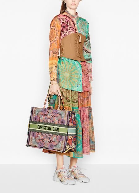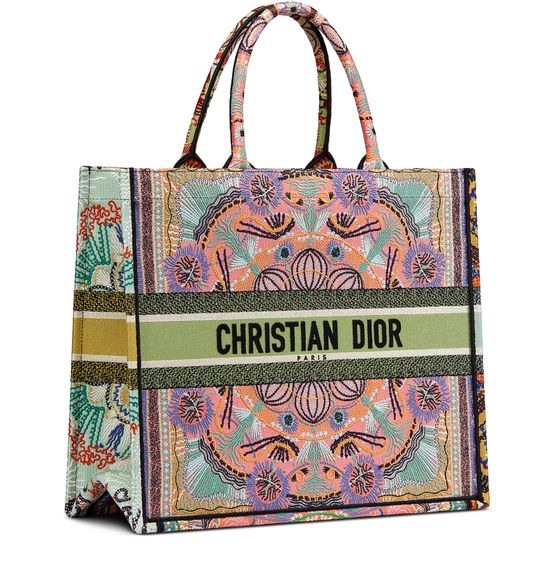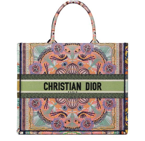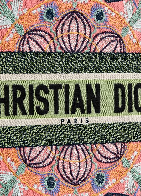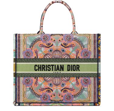 The Dior Book Tote, an original style introduced by Creative Director Maria Grazia Chiuri, has become a staple of the Dior aesthetic. Inspired by the light festivals in the south of Italy, this style is embroidered with the graphic multicolor Dior In Lights motif accented with metallic thread. Each of the four sides of this bag features a different color for a patchwork look. Adorned...