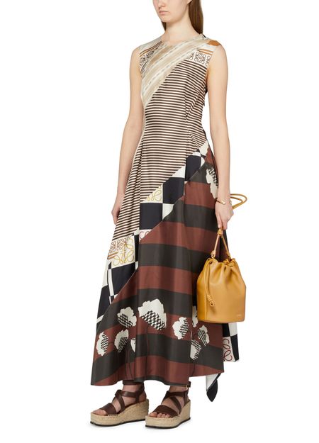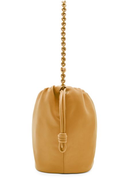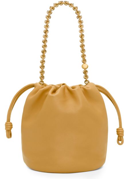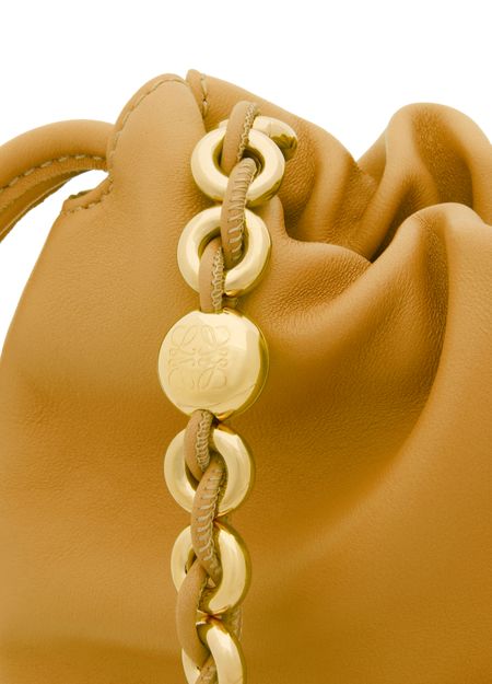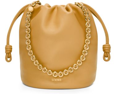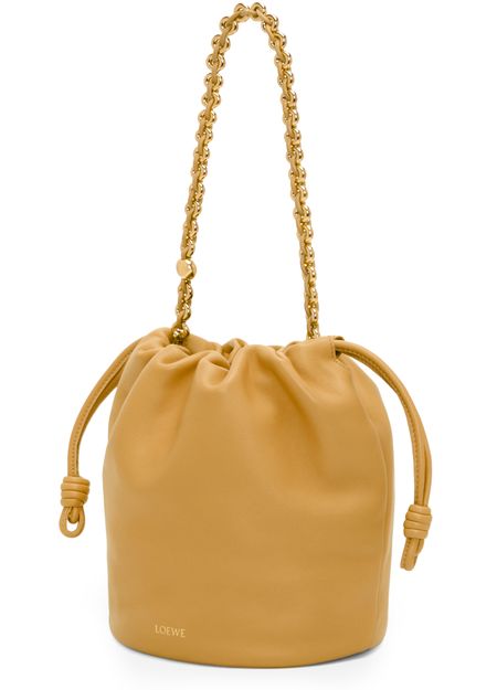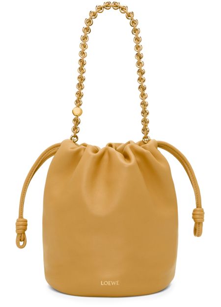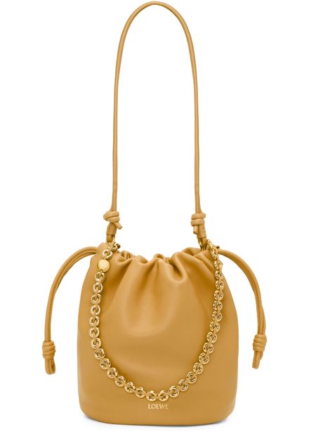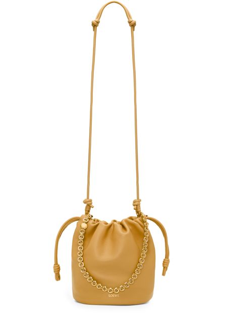 Loewe's Flamenco Purse Bucket bag is a chic hand-carried accessory made of mellow nappa lambskin. It features a front logo, drawstring closure, and a small bucket bag design for a trendy and versatile look.