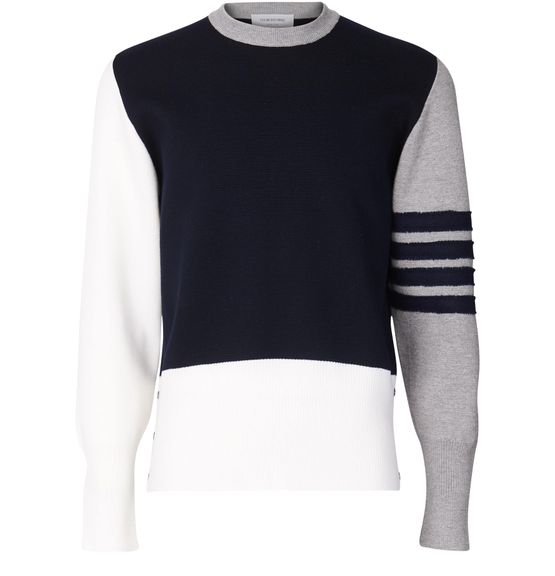 Thom Browne's inventive spirit is embodied by the 4-Bar Funmix sweater; men will love the deconstructed geometric composition on this chic knit.
