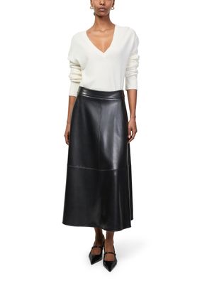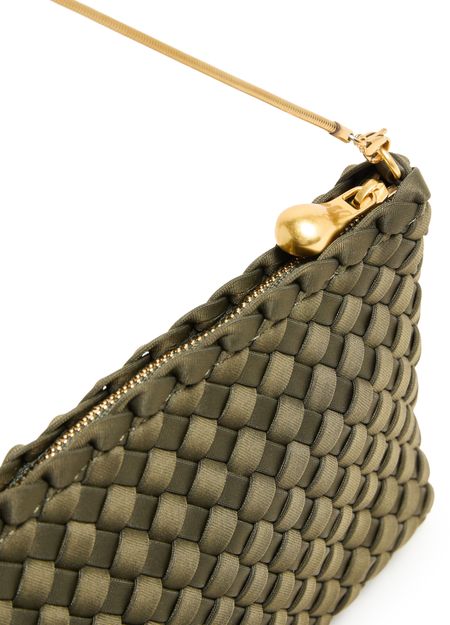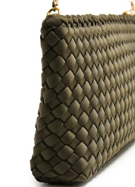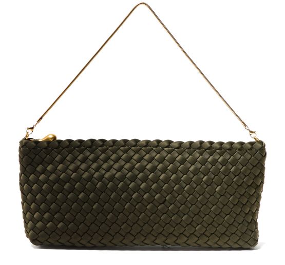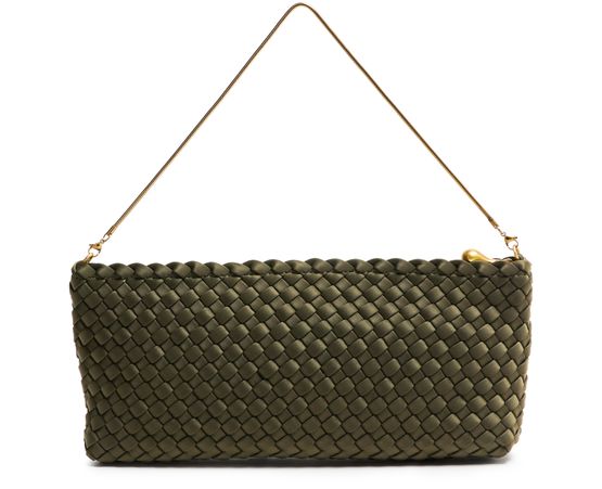 Reveal Naghedi's Gala medium clutch, a statement piece with a gold finish and visible topstitching. The detachable chain strap offers versatile styling, while the single compartment and zipper closure ensure essentials stay secure. This modern clutch blends refined details with practical elegance for any occasion.