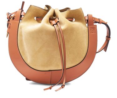 For this catwalk piece, Loewe's master craftsmen took inspiration from the equine world and their own heritage. Created in a blend of suede and calf skin leather, the Horseshoe bag is shaped like a horseshoe. It is fastened with a narrow leather drawstring. Wear it cross-body.
