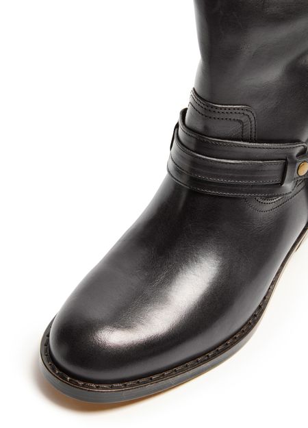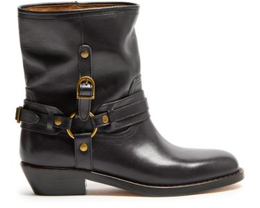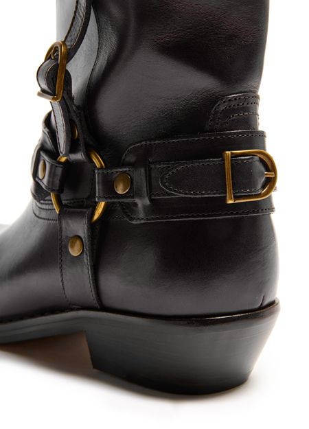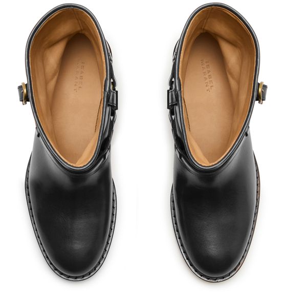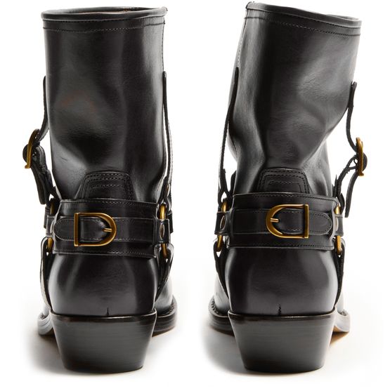 • Description : Ankle boots, smooth leather, block heel, low heel, round toe, buckled ankle strap, antique gold-finish metal details.
