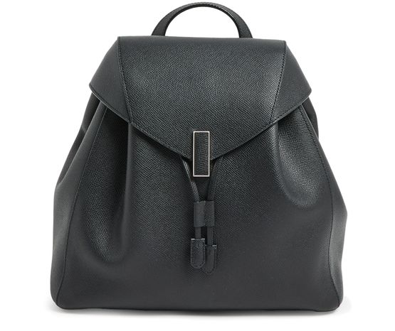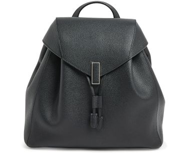 Unveil Valextra's Iside backpack, a masterpiece with a flap closure and silver finish. The single compartment space is accentuated by visible topstitching, offering both style and function. Designed to be carried on the back, it features adjustable and thin straps, along with interior patch pockets for added convenience.