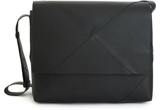 This calf skin leather messenger bag from Bottega Veneta is one of its most fashionable creations. This large, rectangular accessory can be carried over your shoulder or cross body. There are two crossed diagonal lines of stitching on the front. This extremely elegant piece will pair with a smart suit or something more relaxed.
