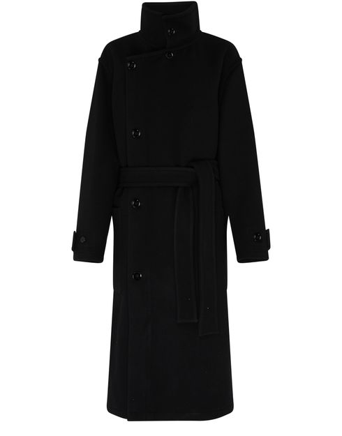 Lemaire's Long belted coat showcases a striking asymmetric cut that drapes elegantly. With a belted waist and mockneck, it offers a tailored silhouette. Long sleeves with buttoned cuffs enhance its sophistication, while front patch pockets add practicality. The buttoned fastening completes this versatile piece, perfect for any occasion.