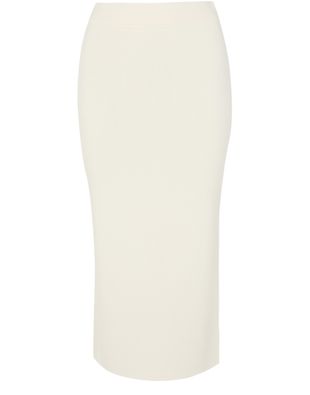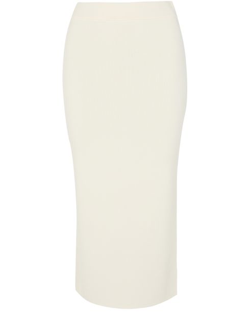 Max Mara's Losanna knitted midi skirt showcases a chic pencil silhouette with knee-length elegance. Its elasticated waist ensures a comfortable fit, while the back slit adds a touch of allure. Visible stitching highlights the craftsmanship, making this skirt a versatile piece perfect for both casual outings and sophisticated events.