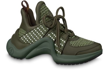 The iconic LV Archlight sneaker is revisited in raffia with calf-leather trim, creating a fashionable, cottage-core vibe. This cult sneaker, designed by Nicolas Ghesquière, is instantly identifiable by its bouncy, wave-shaped outsole, which is signed with an LV Circle logo. An LV Circle patch also features on the sneaker's oversized tongue.