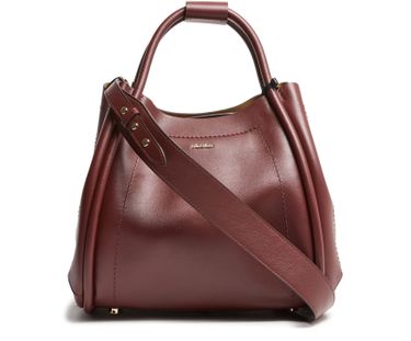 Reveal Max Mara's Marine handbag, a shoulder bag with double handles crafted from smooth leather. The leather handle and visible topstitching enhance its sleek design, while the front logo adds a touch of elegance.
