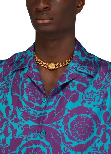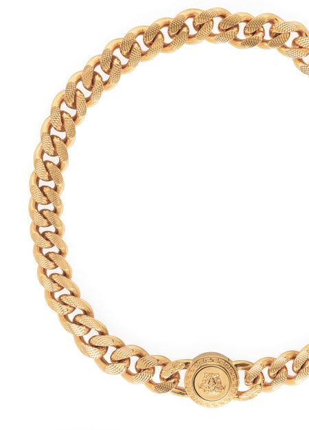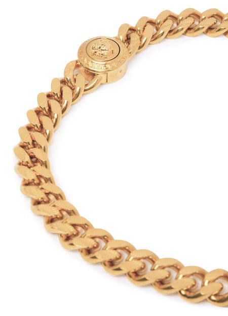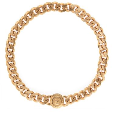 Versace's Medusa chain necklace features a striking choker style that elegantly wraps around the neck. Its curb chain design showcases bold logo details, embodying the designer's branding. With a non-adjustable length, this statement piece effortlessly enhances any outfit, making it a must-have accessory for fashion enthusiasts.