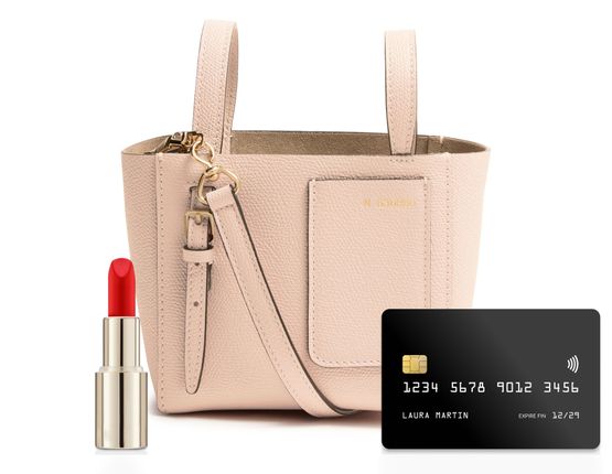 Reveal Valextra's micro bucket bag, crafted from grained leather with a refined gold finish. The adjustable, detachable thin strap and double handles offer versatile styling, while visible stitching and a spacious interior with zippered and front pockets ensure both elegance and practicality.