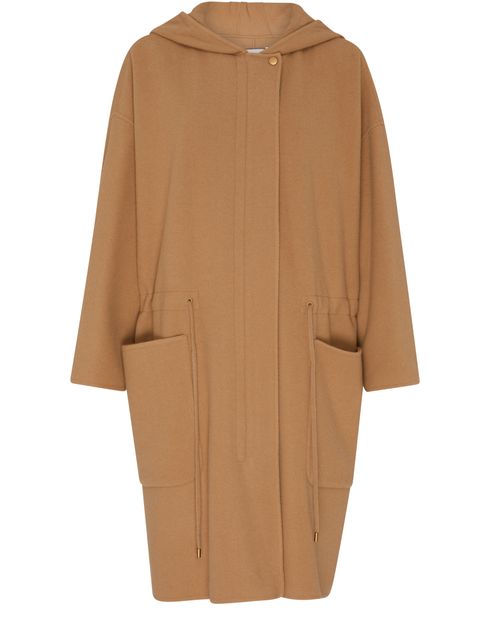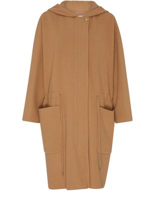 Max Mara's Miele coat is a knee-length classic overcoat designed for sophistication. Its concealed closure enhances a sleek silhouette, while large side pockets offer practicality. Long-sleeved with a cozy hood, this coat effortlessly combines style and function, making it the perfect companion for chilly days and elegant outings.