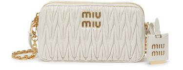 Miu Miu's Mini quilted crossbody bag features a thin strap and detachable strap, along with a single handle for versatile carrying options. It has a gold finish and a metallic logo on the front, with the logo in gold letters. The bag can be worn crossbody and has a zipper closure with a carabiner.