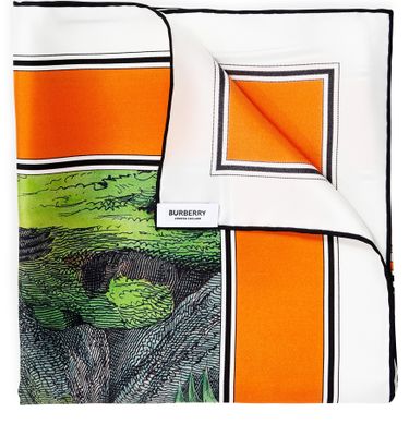 The Burberry Monkey print square for women is made from 100% Mulberry silk. On a white background with an orange border, it features an antique engraving of monkeys with the Burberry London England circular brand name in pride of place.