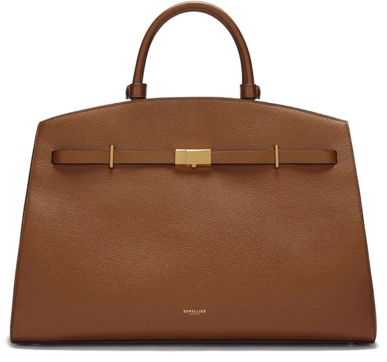 Reveal Demellier's The Hudson handbag, crafted from grained leather with double handles for versatile carrying. The visible stitching and metal finish highlight its refined construction, while a spacious interior compartment and front logo add both function and signature style to this modern shoulder bag.
