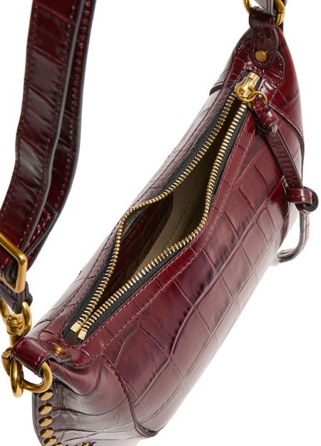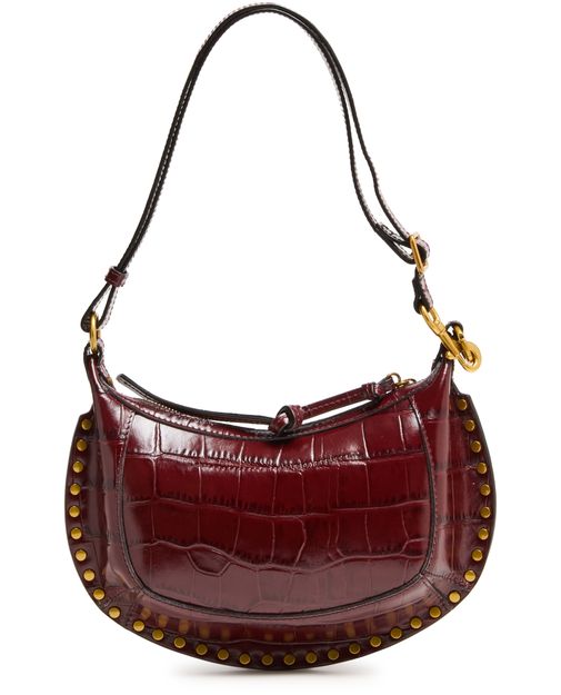Reveal Isabel Marant's Oskan Moon shoulder bag, a masterpiece in crocodile-embossed leather. This bag features a chic front logo, studded details, and a silver finish. Its adjustable, detachable strap offers versatile styling, while the zipper closure ensures your essentials are secure.