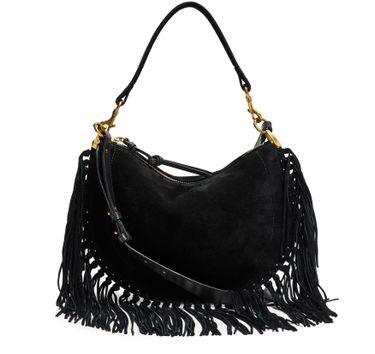 Reveal Isabel Marant's Oskan soft zipped shoulder bag, a masterpiece of suede craftsmanship. This hobo bag features a single handle and an adjustable wide strap for versatile wear. Adorned with fringe details and visible stitching, it closes securely with a zipper, all enhanced.