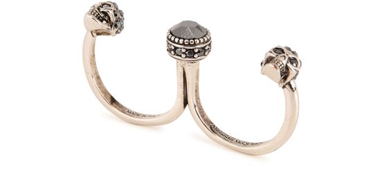 This bold ring is by Alexander McQueen. Made in brass, it features two rings crowned with rhinestone decorated skulls. They are joined by a central stone.