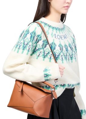 Reveal Loewe's round-neck wool blend sweater, crafted from warm fabric with a modern geometric detail and an embroidered front logo. The long sleeves and classic neckline offer a refined silhouette, making this sweatshirt a versatile choice for both casual and elevated looks.