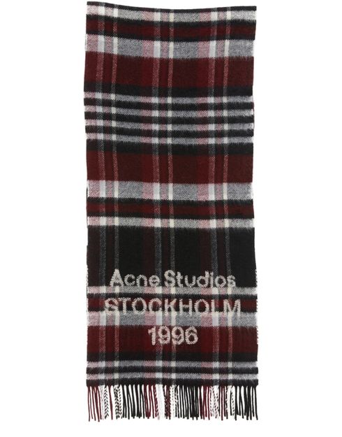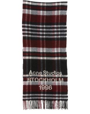 Reveal Acne Studios's check logo scarf, a statement accessory featuring a checked pattern and refined fringed edges. The front logo adds a signature touch, making this scarf a versatile piece for elevating any modern wardrobe with subtle sophistication.