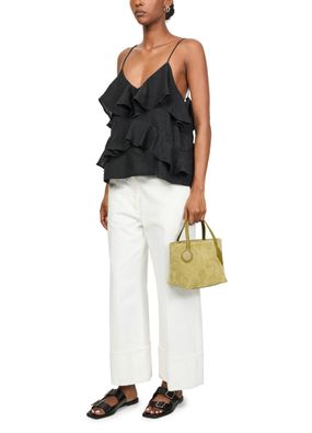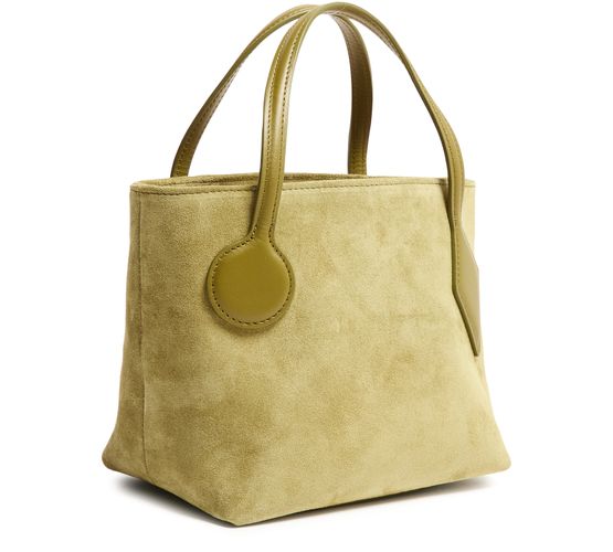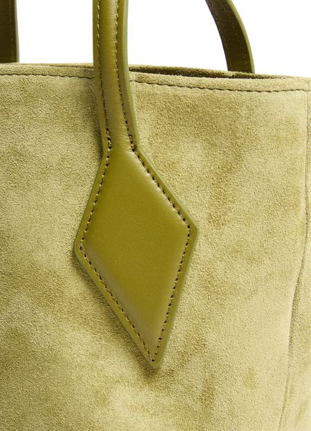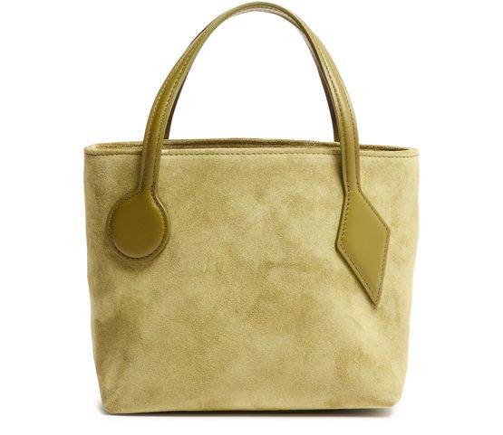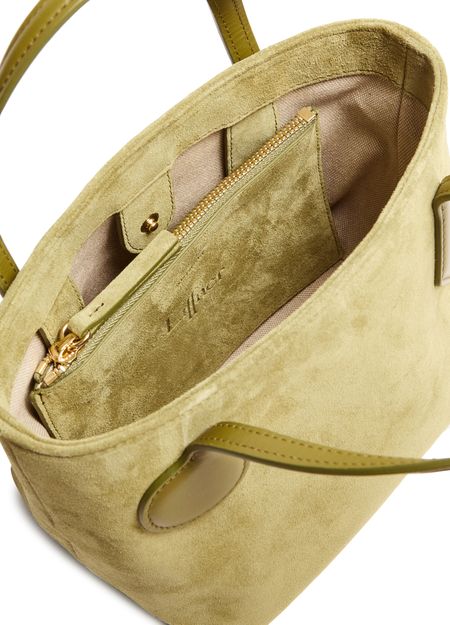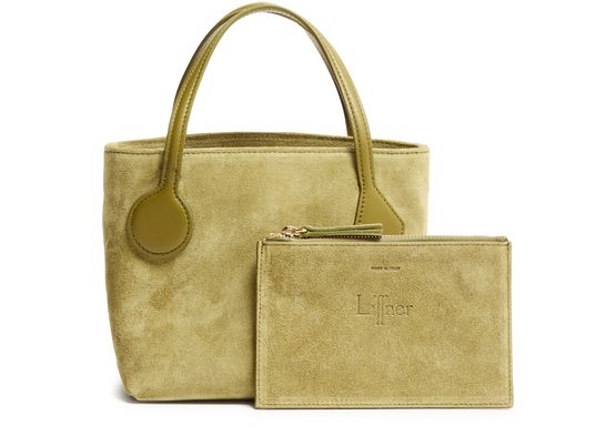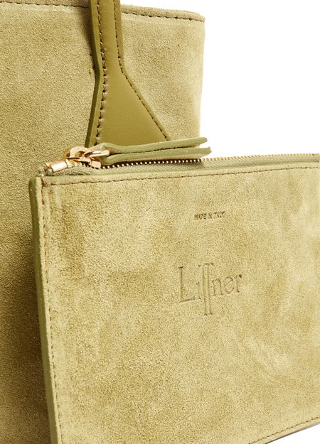 Introducing Liffner's Sprout micro tote bag, a stunning blend of style and utility. Crafted from luxurious suede, it features double handles and a detachable interior purse for seamless organization. The gold finish and embossed logo add an elegant touch, making it a perfect accessory for any occasion.