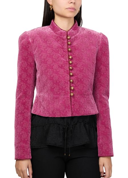 Reveal Chloé's velvet jacket, a cropped masterpiece with a high neck and long sleeves. The button fastening and floral embroidery add a touch of elegance, while the padded texture ensures comfort. Perfect for casual outings, this jacket's embellished buttons make it a standout piece.