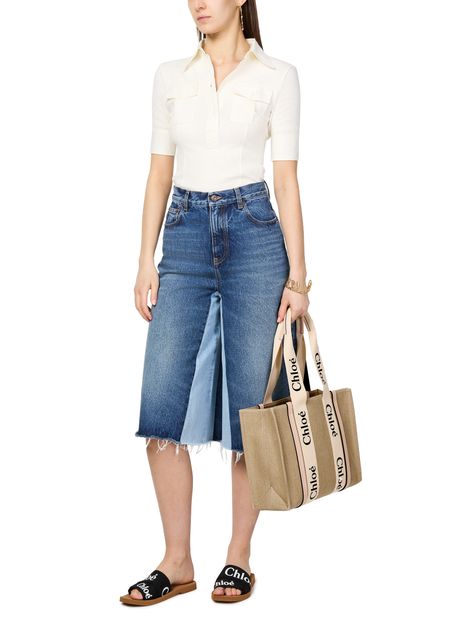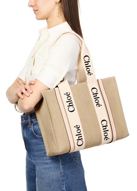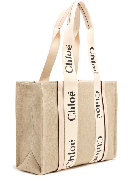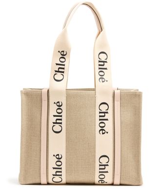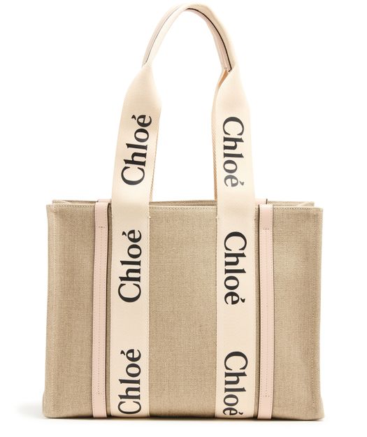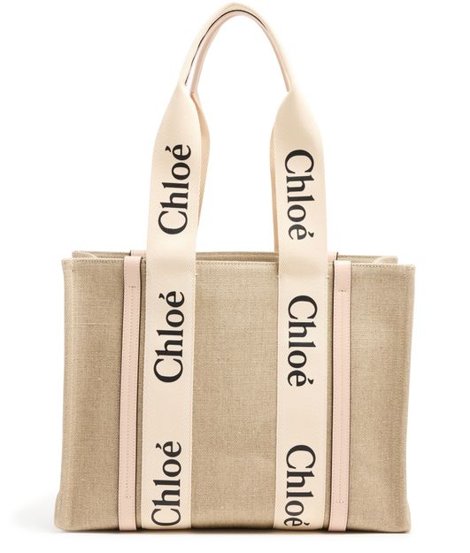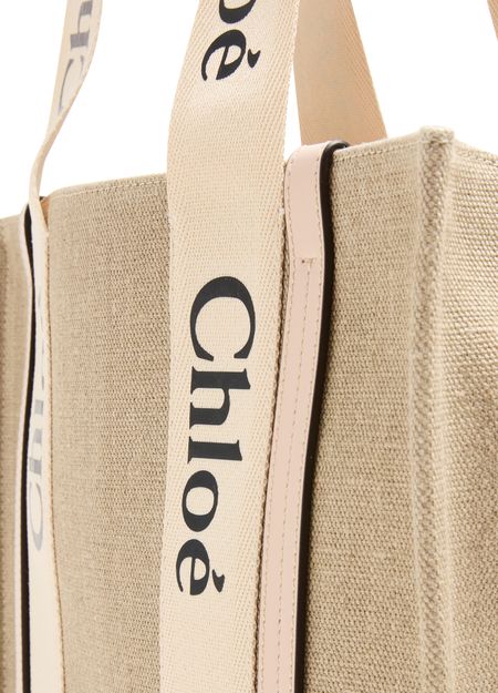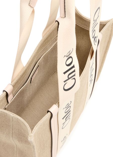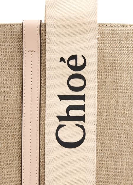 The Woody tote bag from Chloé features two handles and Chloé lettering for a stylish touch. It has a single compartment with an interior patch pocket for organization. The appliquéd logo adds a subtle branded detail. This versatile bag can be worn on the shoulder, and the handle height is 25 cm.