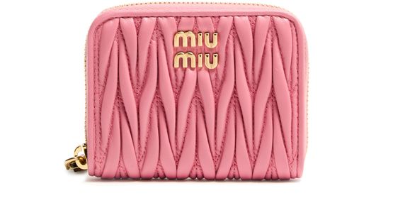 Introducing Miu Miu's zippered quilted leather wallet. This stylish piece combines functionality with elegance, featuring metallic "Miu Miu" lettering and a signature quilted herringbone detail. The wallet is designed with visible topstitching and a secure zipper closure, while interior slots for cards ensure practicality.
