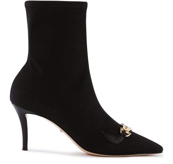 Elongate your legs with these Zumi heeled ankle boots from Gucci. The front of each shoe is embellished with a reworked version of two of the Italian fashion house's iconic symbols: the equestrian-inspired bit and the GG logo. These slim-heeled boots fit snugly around your ankle for a trendy and feminine look.