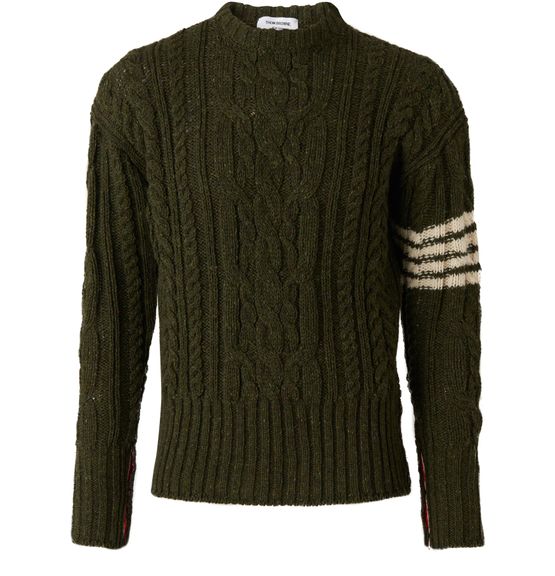This piece reveals the signature style and love of elegance of creator Thom Browne. The vibrant colour, go-anywhere shape and elegant design of the 4-Bar Aran Cable jumper will become a wardrobe staple. Wear this jumper with a slim fit cotton shirt and straight cut trousers.