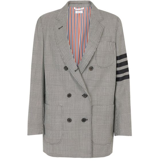 This 4-Bar wool jacket sets the tone for the Thom Browne brand's bold style. A women's creation with a mesmerizing chequered pattern, with the four parallel lines on the long sleeve.