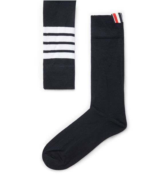Thom Browne's 4-Bar socks showcase a durable performance fabric designed for both style and comfort. The iconic striped pattern adds a touch of sophistication, while the outer label emphasizes the brand's signature flair. Perfect for elevating any outfit, these socks blend functionality with a unique aesthetic for the modern individual.