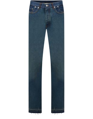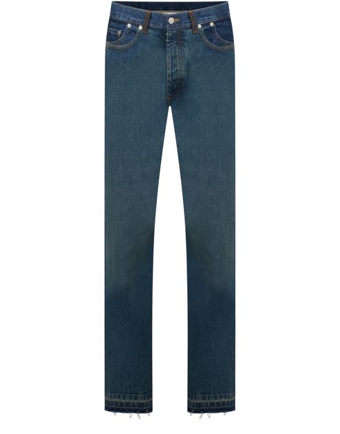 • Description : Straight-cut jeans, faded denim, front button, five-pocket style, belt loops, fringing, concealed zipper.