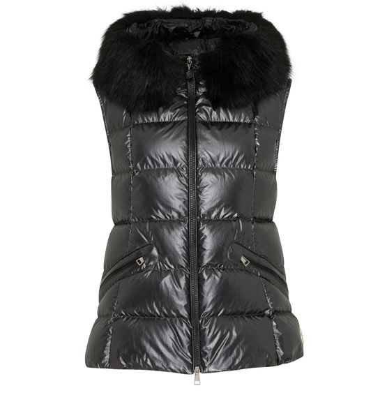 Moncler's Anse down jacket is a sleeveless puffer vest, designed for style and warmth. Its short cut features a front logo and a secure zipper closure, complemented by side pockets for practicality. The fur detail adds a touch of luxury, while the padded texture ensures comfort in chilly conditions.