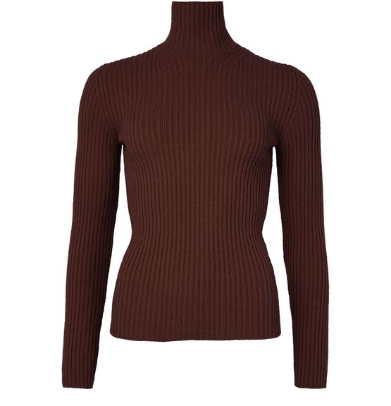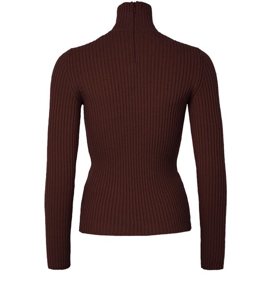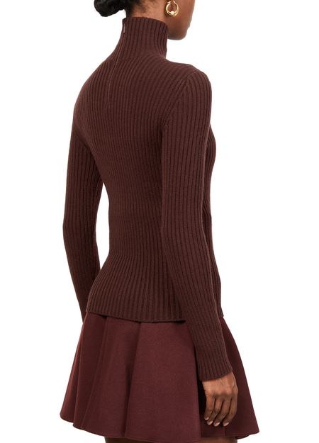 Reveal Max Mara's ribbed turtleneck sweater, a masterpiece in knitwear. This slim-fit design features a back zipper closure and long sleeves, offering a sleek silhouette. The ribbed texture adds depth, making it perfect for both casual and formal settings. Pair it with tailored trousers or a chic skirt for a refined look.
