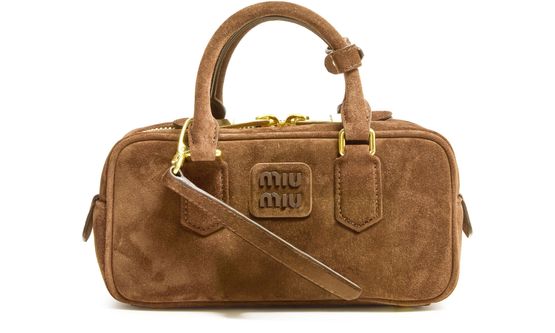 Introducing Miu Miu's Arcadie suede bag, a masterpiece of modern design. This mini bag features a detachable thin strap for versatile wear, while the metallic 'Miu Miu' lettering adds a touch of elegance. With a single compartment and zipper closure, it combines style with practicality.